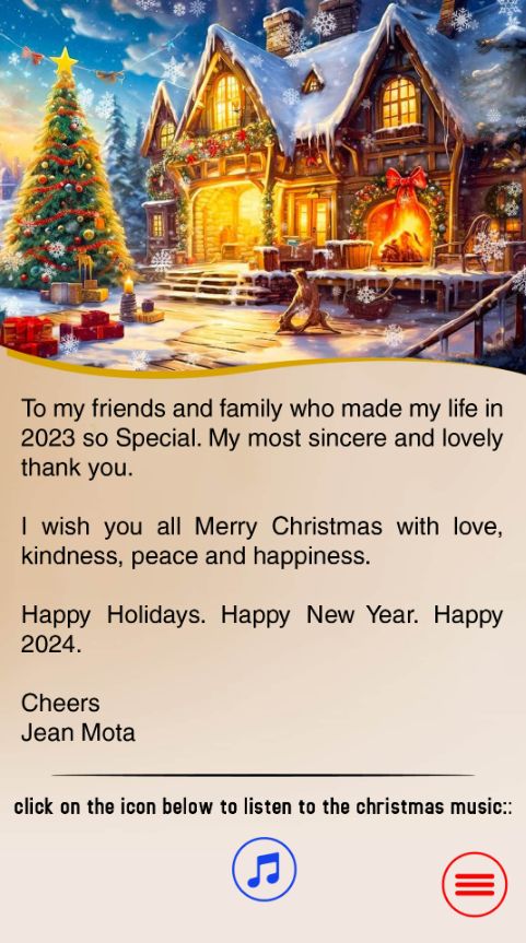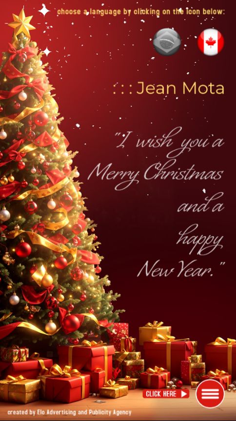 Este modelo possui 04 Folhas (02 para cada idioma). Capa: animação de flocos de neve e estrela natalina brilhando, ícones de cada país, 01 imagem de fundo que pode ser personalizada, 01 texto de Feliz Natal, 01 logotipo na capa caso seja uma empresa e um botão de menu para acessar a página interna. Página Interna: foto natalina, mensagem de natal e links de contatos (whatsapp – instagram – facebook e/ou linkedin e site).