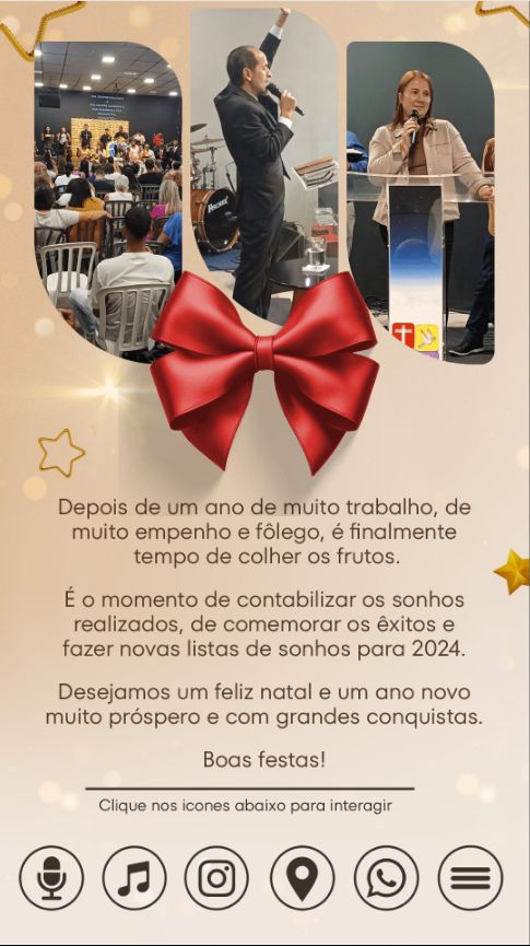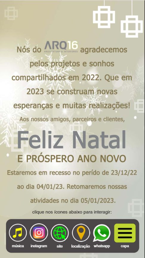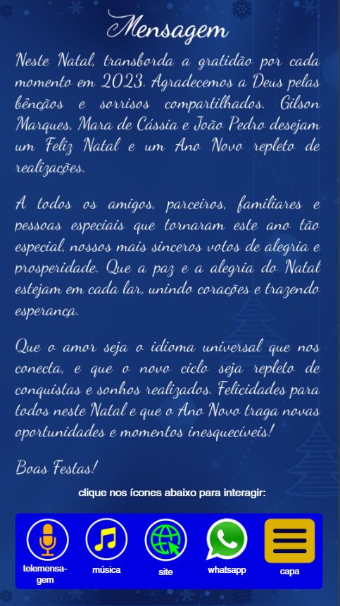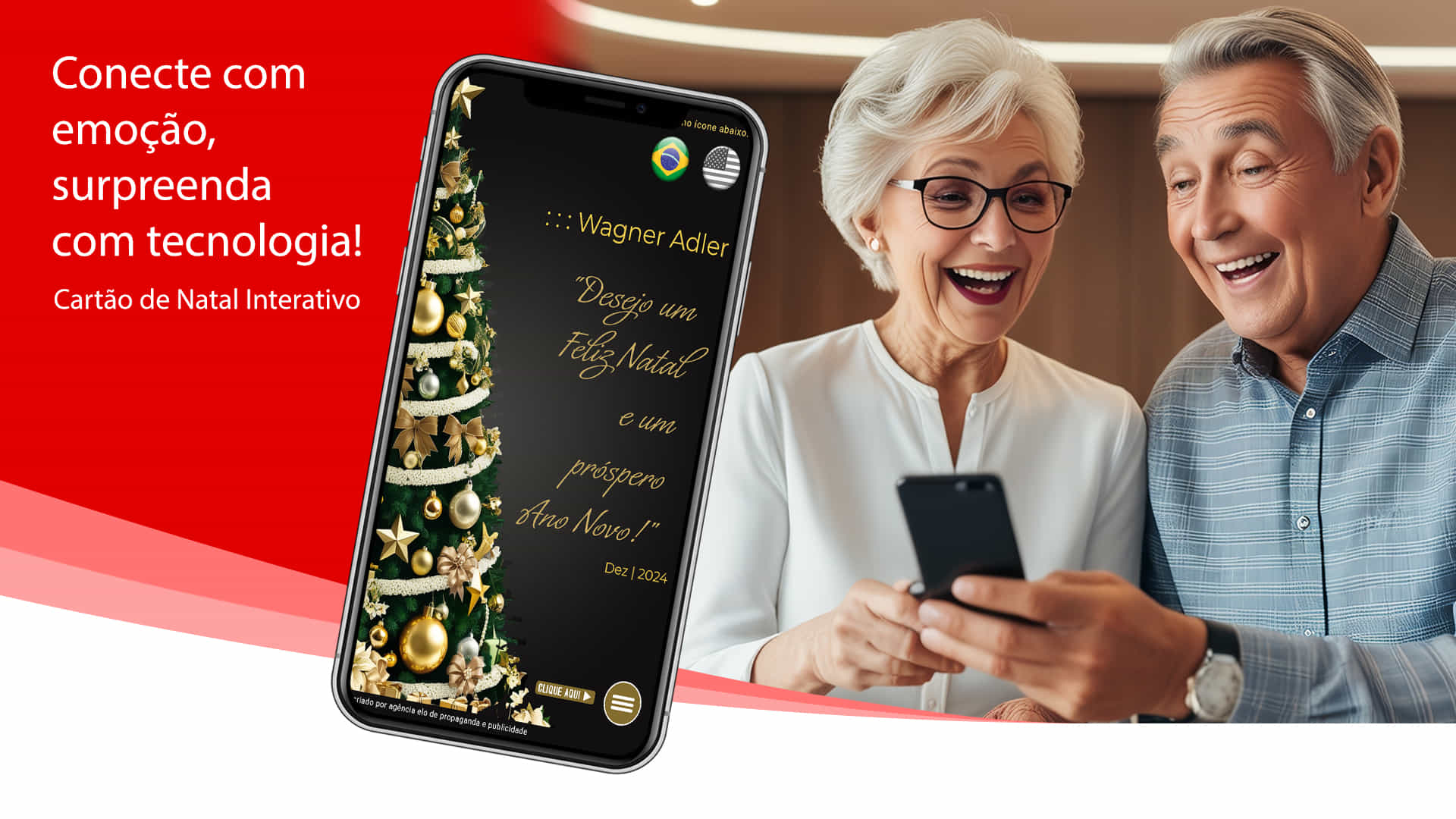 O Cartão de Natal Interativo é muito mais do que um PDF ou um aplicativo – ele é uma ferramenta digital totalmente interativa, sem necessidade de instalação, que transforma a experiência de envio e recebimento de cartões! Com funcionalidades WEB integradas, o cartão permite animações personalizadas, efeitos de transição, inserções de textos, imagens e links, slideshows, galerias de imagens, áudio e vídeo, efeitos visuais, Google Maps, formulários, fotos 360º, simuladores 3D, QR Code e muito mais! Acessado facilmente via link com miniatura, compartilhado pelo whatsapp, redes sociais ou e-mail, ele é prático para ser visualizado, compartilhado e até favoritado no smartphone, proporcionando uma experiência única e inovadora.