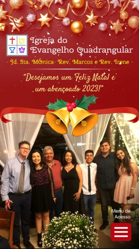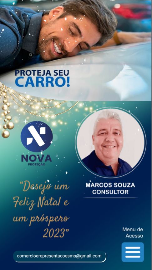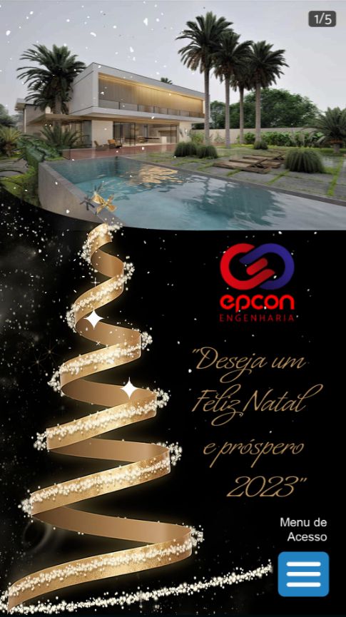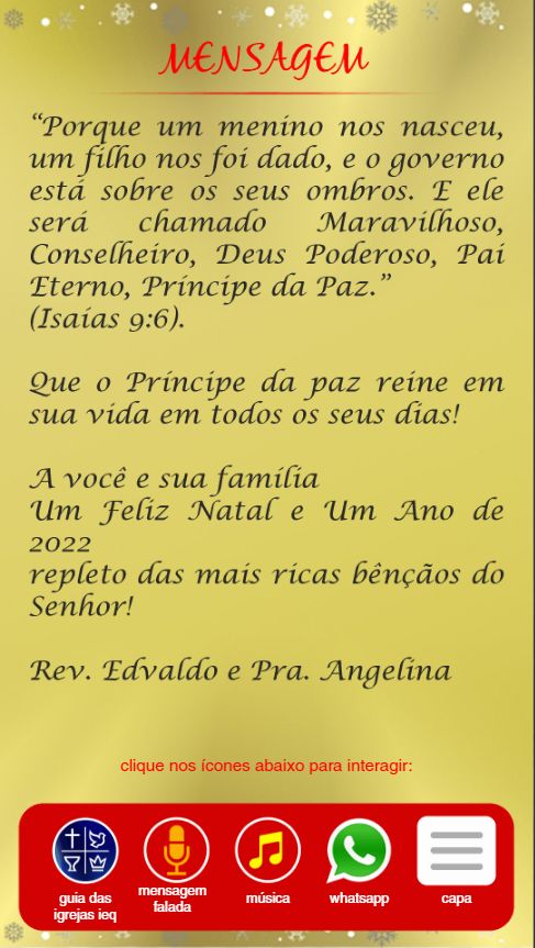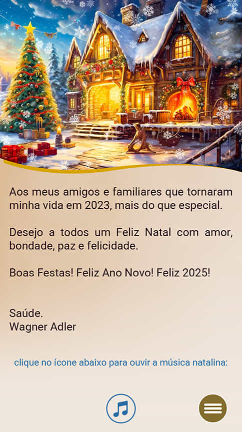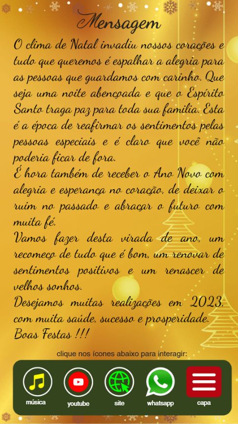 Este modelo consiste em 02 Folhas (Capa e Parte Interna). Capa: animação de flocos de neve e estrela natalina brilhando, 01 imagem de fundo que pode ser personalizada, 01 texto de Feliz Natal, 01 logotipo na capa caso seja uma empresa e um botão de menu para acessar a página interna. Página Interna: foto natalina, mensagem de natal e links de contatos (whatsapp – instagram – facebook ou linkedin e site).